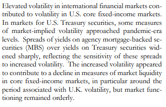 - 국제 금융 시장의 변동성 증가는 미국 핵심 고정 소득 시장의 변동성에 기여했다.