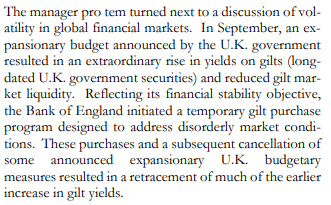 - 9월에 영국 정부가 발표한 확장 예산은 Gilts(영국의 장기 국채)의 수익률을 이례적으로 상승시키고 Gilt 시장의 유동성을 감소시키는 결과를 낳았다.