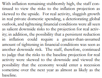 - 따라서 직원들은 실물활동에 대한 기준선 예측에 대한 위험이 하방으로 치우쳐 있다고 계속 판단하고 향후 1년 동안 경기가 침체 국면에 진입할 가능성을 기준선과 거의 동일하게 보았다.