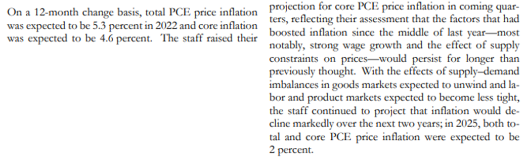 - 직원들은 작년 중반 이후 인플레이션을 끌어올린 요인들, 특히 강한 임금 상승과 공급 제약이 물가에 미치는 영향이 이전에 생각했던 것보다 더 오래 지속될 것이라는 그들의 평가를 반영하여 다가오는 분기에 핵심 PCE 물가 인플레이션에 대한 전망을 높였다.
