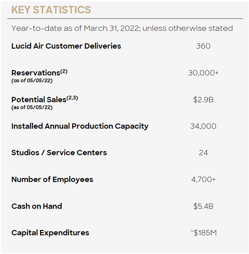 루시드는 1분기 고객들에게 360대의 차량을 납품한 것에 대해 5770만 달러의 1분기 수익을 보고했다. 컴퍼니는 29억 달러의 잠재적 매출액을 반영하여 현재 3만 달러를 초과하는 루시드 에어에 대한 강력한 고객 수요를 보고했다.