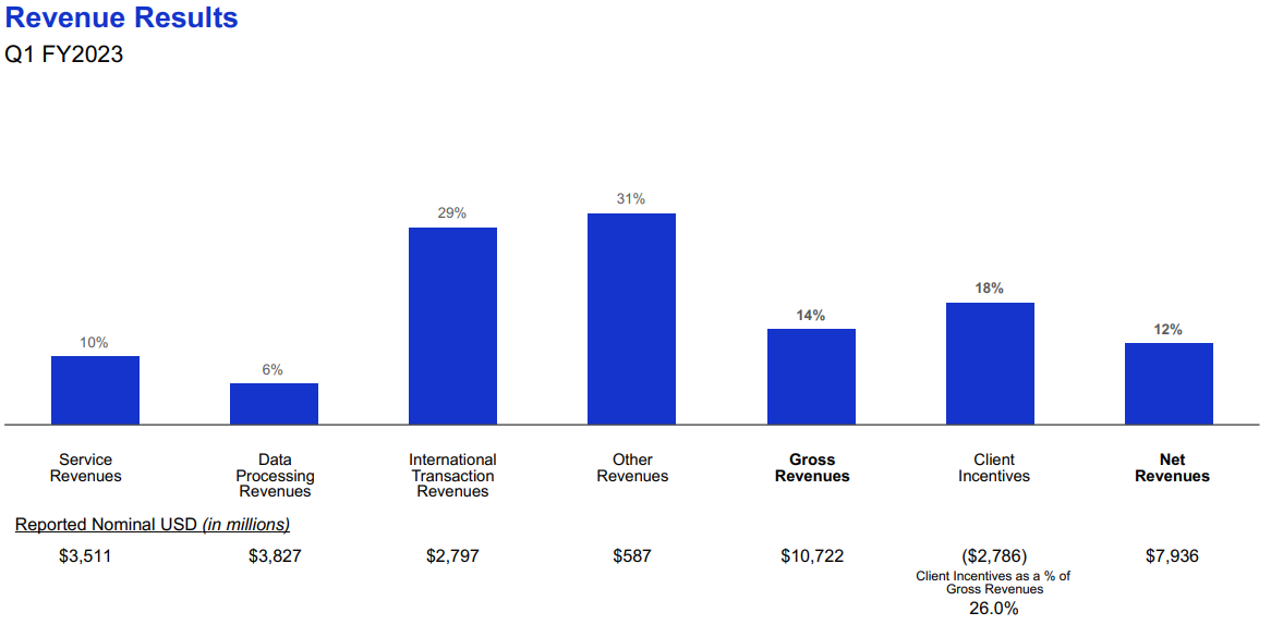 - 회계연도 1분기 순수익은 12% 증가한 79억 달러로, 결제량, 국가간 거래량 및 처리된 거래의 전년 대비 증가에 힘입었습니다. 순수익은 고정 달러 기준으로 15% 증가했습니다.