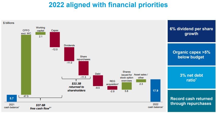 - 2022년 496억 달러의 운영 현금 흐름과 376억 달러의 잉여 현금 흐름을 기록하는 연간 현금 흐름