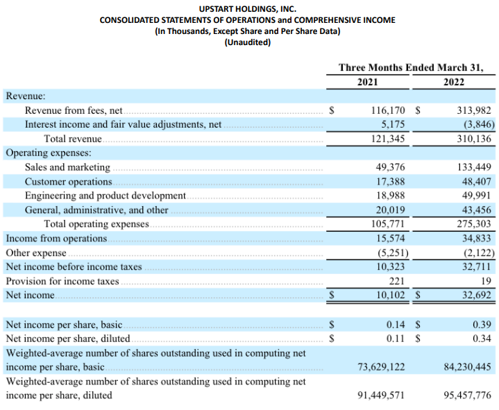 업스타트는 2022년 2분기에 다음을 예상하고 있습니다.