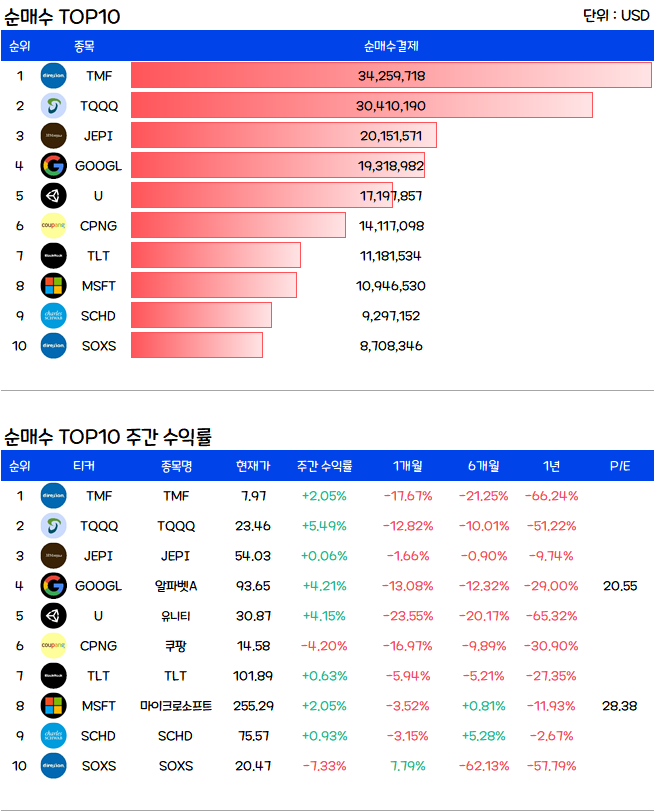 3월 1주차 미국주식 순매수 TOP10, 씸플요약입니다.